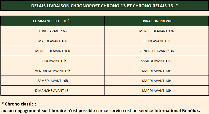 - Passez vos commandes en début de semaine pour le recevoir dans la semaine de la prise de commande, cela évite des délais supplémentaires liés aux week-end ou jours fériés.